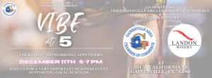 Our December VIBE at 5 will be co-hosted by the Gainesville Area Chamber of Commerce and Landon Winery. This event is open to the public and free to attend; however, we encourage everyone to bring at least two non-perishable food items for VISTO, to receive two free drink tickets. It is also encouraged to bring business cards to share. Join us for this VIBE at 5, where every interaction adds to the pulse of our amazing community